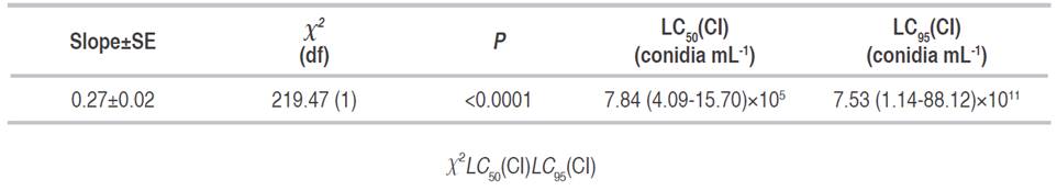 The test unit was a Petri dish containing ten symphylids previously placed in a sterile lid with a hole in the center to limit the sprinkling of the fungus on the arthropods. Inoculation involved pouring the spore solution on each unit, allowing to contacting with the symphylids for three minutes. The symphylids were then transferred to another sterile Petri dish with a filter paper moistened with sterile distilled water. Each of the spore concentrations was administered three times in duplicate, providing a total of six test units. The Petri dishes were then incubated at room temperature and in the dark for ten days. Periodic reviews were made to keep the filter paper moist in the Petri dish. Normal controls consisted of using symphylids inoculated with sterile distilled water that substituted the spore solution in the procedure described before. Mycosis readings per symphylid were carried out after ten days using a stereoscope. The percentage of mycosis was calculated as ten times the number of symphylids infected with fungus. Mycosis by the strain UdeA0106 was confirmed by direct cultivation on PDA agar.