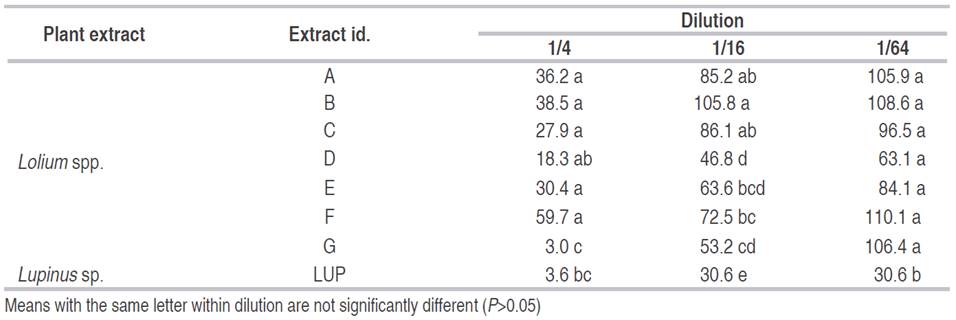 Brassicaceous accessions from a local field were tested: B. fruticulosa subsp. mauritanica, B. fruticulosa, B. tournefortii, B. tournefortii, Sinapis arvensis subsp. arvensis, B. carinata, Raphanus sativus, R. sativus, B. juncea, B. juncea (oriental), B. tournefortii, B. oxyrrhina, B. napus subsp. oleifera, Sinapis alba, Crambe abbyssinica and Crambe hispanica (identified as extract: 1, 2, 3, 4, 5, 7, 8, 9, 10, 11, 13, 15, 17, 18, 20 and 21, respectively, showed in Figure 2). The extracts of Brassicaceae and one extract of Lupinus sp. were obtained with a blend of 3 g of fresh shoot material in 6 mL of phosphate buffer (25 mM, pH 7, with 15 mg L-1 streptomycin), later sieved, centrifuged and used directly to make dilutions. Seven grasses, belonging to Lolium spp., were collected from dried meadows, and these samples were roasted for 3 hours from 160 to 260 °C before extracting the active components. Grasses were identified by letters (A, B, C, D, E, F, and G), as shown in Table 2. Grass A was not heat-treated while G was the most exposed to high temperatures. Grass extracts were made by blending 10 g of dried grass for one hour in 40 mL of extraction buffer.