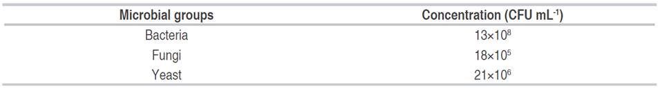 The efficient microorganisms (bio-product) was obtained from the bio-pesticide production laboratory “LABIOFAM” at the province of Matanzas. The microbiological composition analysis of the EM bio-product used was conducted at the Laboratory of Microbiology of the Faculty of Agronomy Sciences of Universidad de Matanzas, Cuba. The isolation of the microbial groups (bacteria, fungi, and yeast) from EM bio-preparation was carried out using 1 mL of the sample following the serial dilutions methodology (Stanier, 1996). Dilutions up to 10-6 were prepared in a sterile saline solution (0.9% of NaCl). 0.5 mL of the dilutions was inoculated on Nutrient Agar Medium for bacteria (10-6), Saborout Agar Medium for fungi (10-5) and Potato Dextrose Agar Medium for yeast (10-4). Petri dishes for bacteria were incubated at 37 °C for 24 h, whereas fungi and yeast were grown at 30 °C for 72 h. Table 1 shows the concentration of the main microbial groups found in the initial EM preparation.