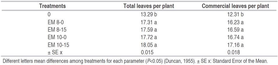 The application of EM increased the number of total leaves and the number of commercial leaves of lettuce (Table 2). Regarding the total leaves number, all the treatments with the application of efficient microorganisms displayed higher values compared with the control. Similarly, the number of commercial leaves in 0 (control) was lower than the variants with different dose of EM and times of application.