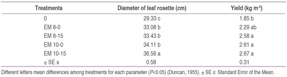 The EM application increased the diameter of leaf rosette and yield (Table 3). The treatment with EM inoculation of 10 mL m-2 at 0 and 15 days after transplanting recorded the maximum diameter among the different variants of EM applications, which values ranged between 29.33 up to 36.56 cm. The diameter of leaf rosette in plants control was lower in comparison with all the assayed treatments.