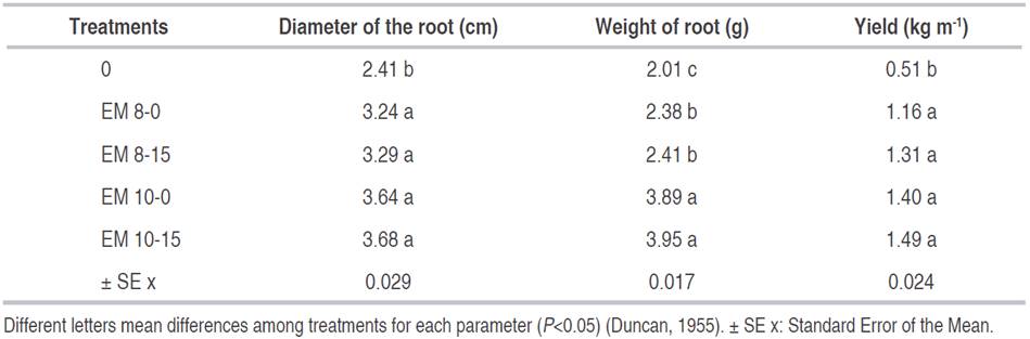 The effect of the inoculation of efficient microorganisms on the diameter, weight, and yield of radish fleshy root are shown in Table 4. The application of EM revealed significant root growth-promoting effects, increasing productivity. Regarding the diameter of root and yield, all the treatments with EM showed higher results than the control without statistical difference among them. Regarding the root weight, EM 10-0 (3.89 g) and EM 10-15 (3.95 g) showed the best results in comparison with EM 8-0 and EM 8-15. The control registered the minimum yield with an average of 0.51 kg m-1. The obtained yield with the application of EM was higher than the reported by the National Group of Urban Agricultural in 2007 ranged between 0.5 to 0.8 kg m-1.