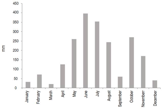 Figure 1: Rainfall (mm) in the Araucano piedmont during 2015 (Based on historical data collected in the region, IDEAM, 2020)