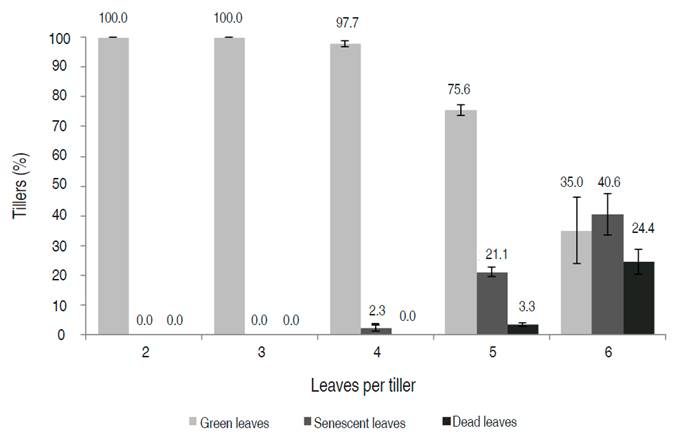 The number of leaves per tiller was established, counting the number of leaves from the bottom of the tiller to its top. Data were recorded considering expanding, expanded, senescent, and dead leaves: a) Expanding leaf: the blade of the leaf was not fully exposed, b) expanded leaf: the ligule was visible, c) senescent: less than 50% of the leaf blade showed signs of senescence. d) Dead: more than 50% of the leaf blade showed signs of senescence.