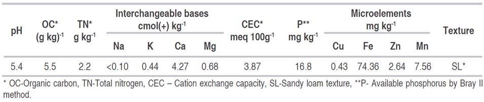 This experiment was conducted in a farm located in the municipality of Tame (6°52’36.55” N, 71°68’96.23” W), in an established pasture of B. decumbens cv. Basilisk. The study began on September 15 and ended on December 15, 2016. Rainfall was 256 mm during the experimental period, and the average temperature was 26.7 oC. However, the rain was not evenly distributed and did not rain in the last 20 days of the experiment. According to soil composition (Table 1), dolomite lime (300 kg ha-1), diammonium phosphate (250 kg ha-1), urea (11 kg ha-1), and sulfur (18 kg ha-1) were applied in an area of 250 m2. The selected pasture area was defoliated before fertilizing at 25 cm height on September 27, 2016.