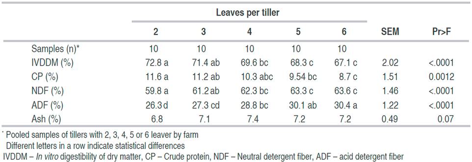 A pooled sample by farm of leaves per tiller (2, 3, 4, 5, or 6), were dried at 65 °C for 48 hours and ground in a Wiley type blade mill to determine de nutritional quality of the tiller with a different number of leaves. Samples were analyzed for dry matter (DM), ash, crude protein (CP) (AOAC, 2012), neutral detergent fiber (NDF), acid detergent fiber (ADF) (Van Soest et al., 1991) and in vitro digestibility of dry matter (IVDDM) (Tilley and Terry, 1963).
