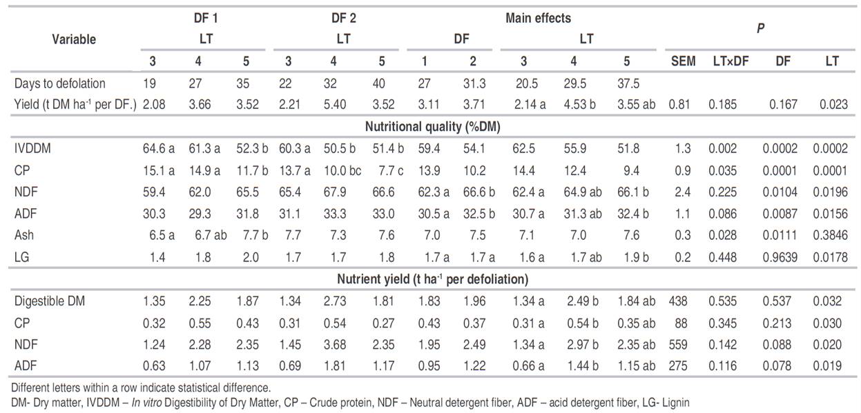 Table 3: Days to harvest, dry matter yield, nutritional quality, and nutrient yield of pastures of Brachiaria decumbens defoliated at 3, 4, or 5 leaves per tiller (LT) in two consecutive defoliations (DF).