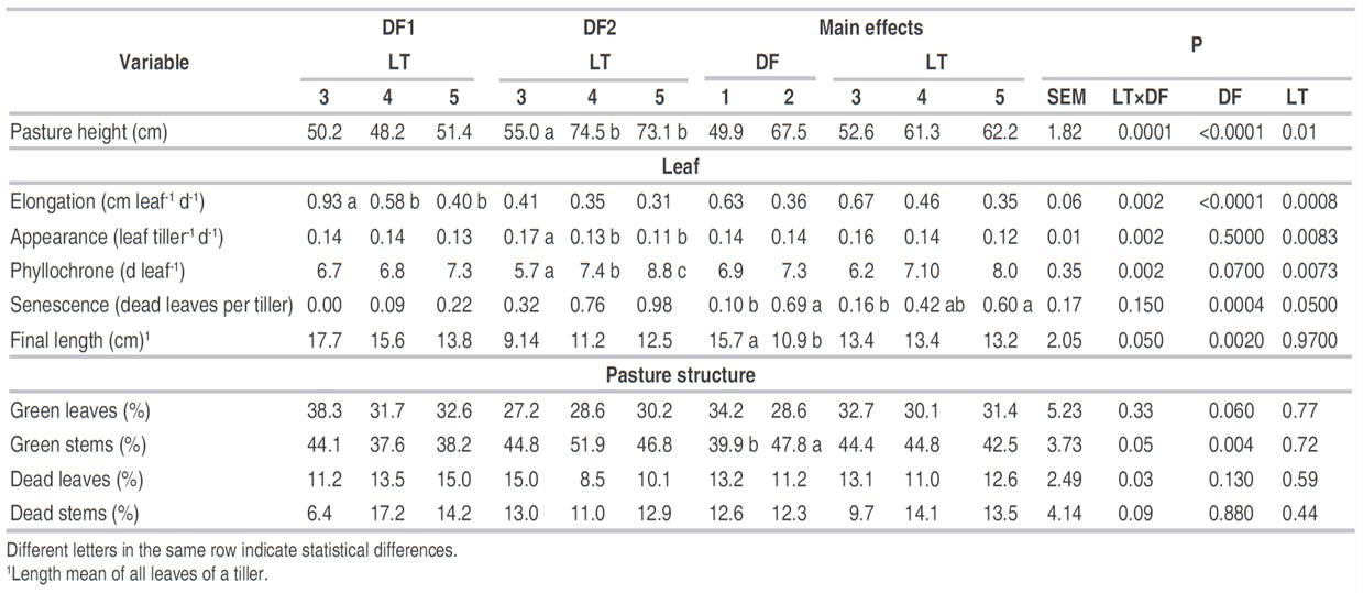 Table 4: Pasture height, leaf growth characteristics, and structure of Brachiaria decumbens pastures defoliated at 3, 4, or 5 leaves per tiller (LT) in two consecutive defoliations (DF).