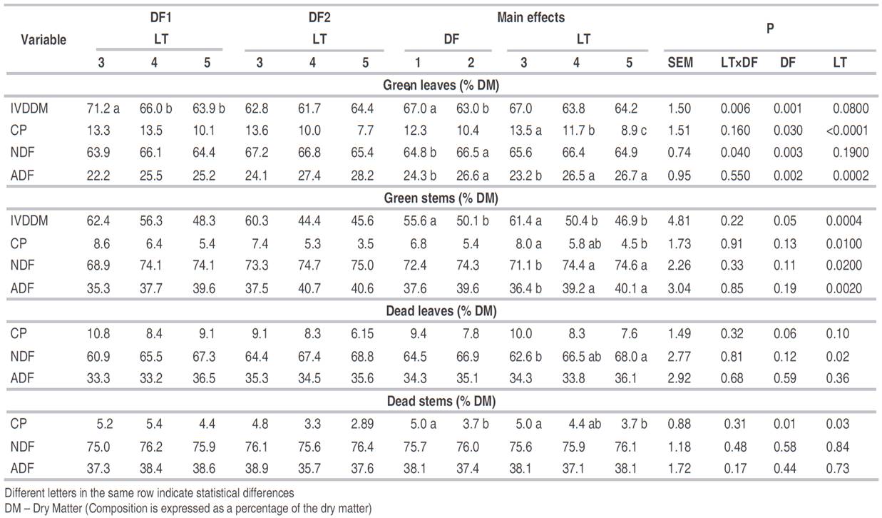 Table 5: Nutritional quality of green leaves, green stems, dead leaves, and dead stems of Brachiaria decumbens pastures defoliated at 3, 4, or 5 leaves per tiller (LT) in two consecutive defoliations (DF).