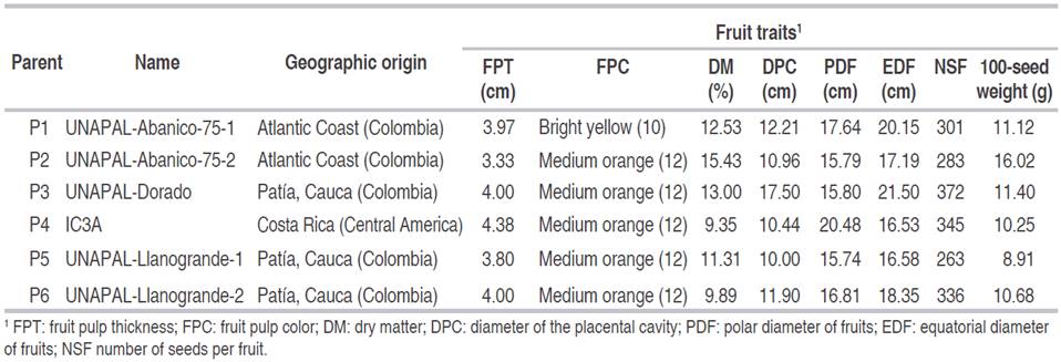 The following traits were evaluated: fruit pulp thickness (FPT) measured in cm; fruit pulp color (FPC) ranked from 1 to 15 based on the Roche Yolk Color Fan scale (Vuilleumier, 1969); dry matter (DM) measured as %; diameter of placental cavity (DPC), polar diameter of fruits (PDF), and equatorial diameter of fruits (EDF), all three measured in cm; number of seeds per fruit (NSF); and 100-seed weight measured in g. DM was determined by measuring the fresh weight of fruits and then oven-drying the fruits at 105 °C for 24 hours (Leterme and Estrada, 2012).