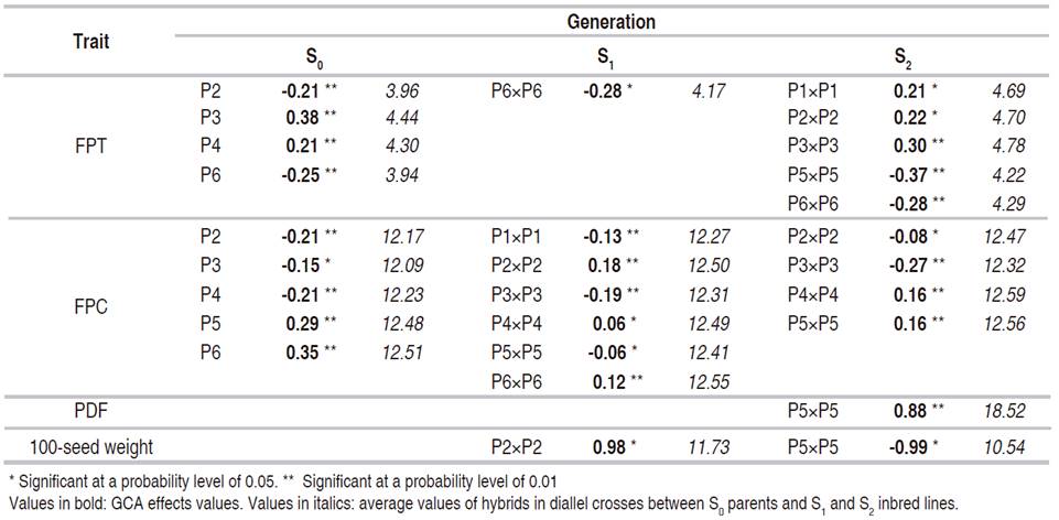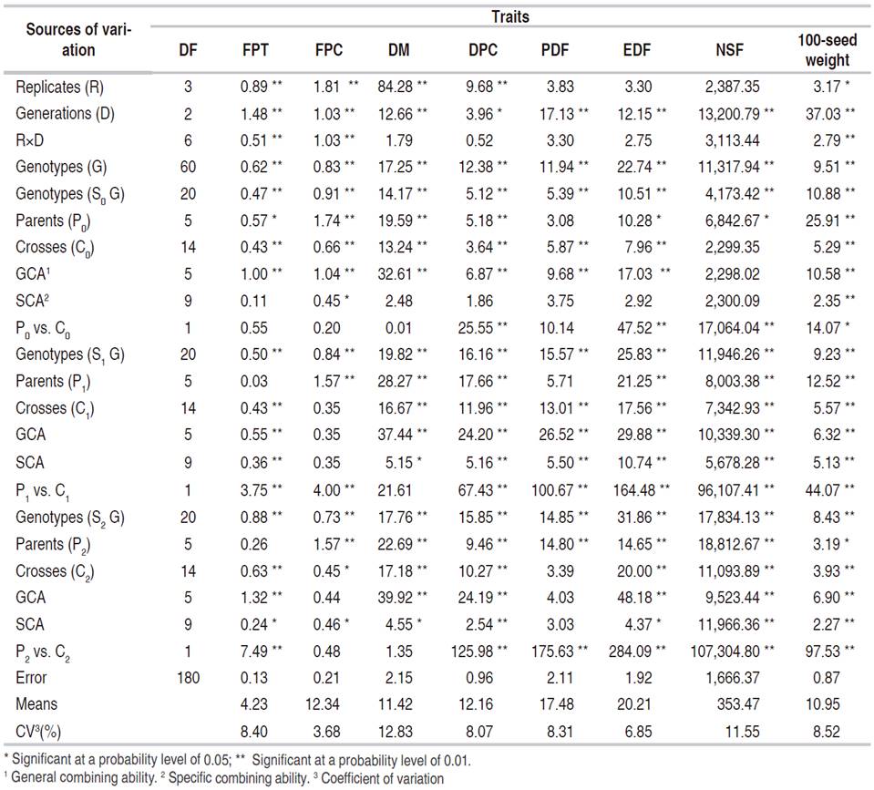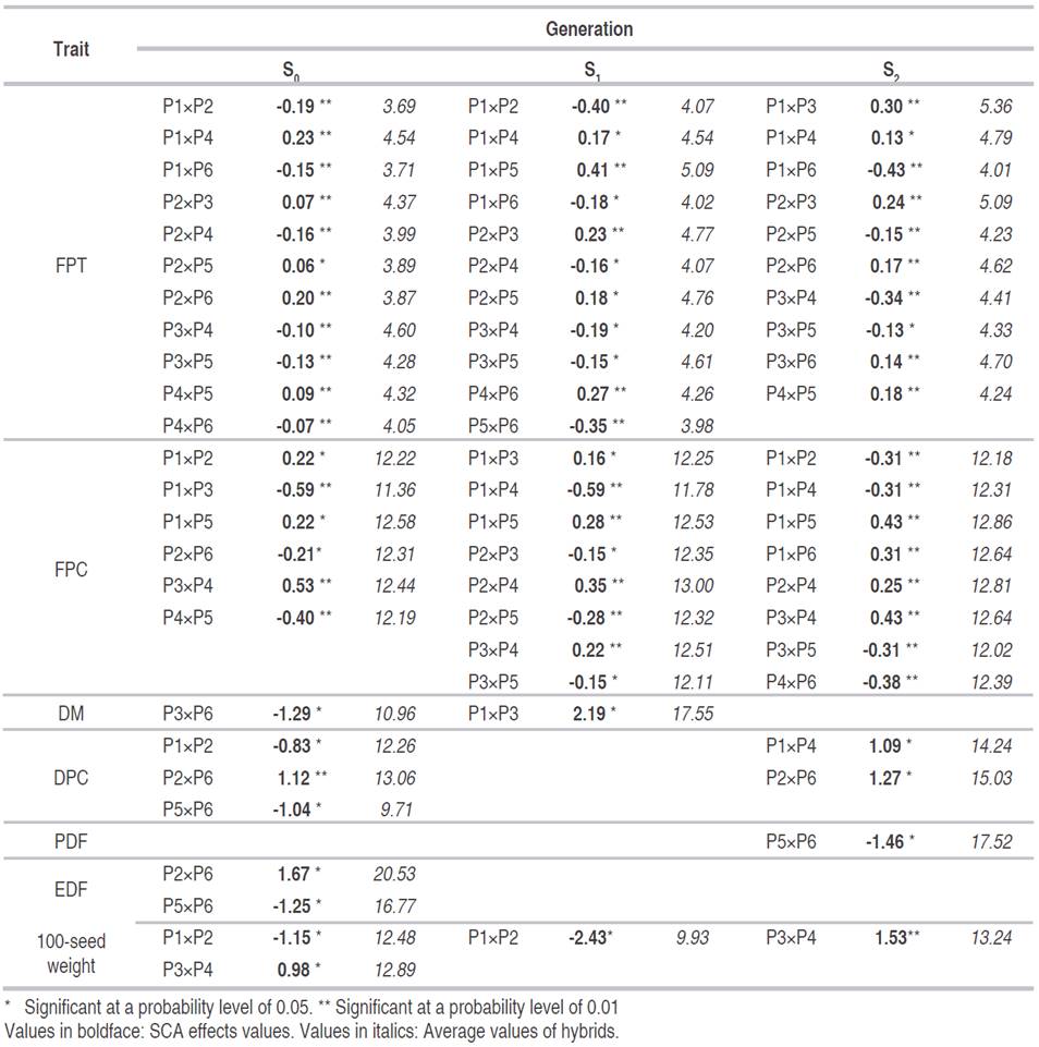In the source of variation corresponding to the contrast between parents vs. crosses (P vs. C), significant differences were detected for most of the traits of the inbred generations, S1 (FPT, FPC, DPC, PDF, EDF, NSF, 100-seed weight) and S2 (FPT, DPC, PDF, EDF, NSF, 100 seed-weight), indicating that, overall, the average performance of all F1 crosses (between S1 or S2 inbred lines) was higher than the average performance of parents as a whole (Table 2). Similar results were found by Espitia (2004) in S1 for FPT, NSF, and 100-seed weight. On the other hand, in the S0 inbred generation, statistical differences were only observed in the P vs. C contrast for DPC, EDF, NSF, and 100-seed weight (Table 2). Espitia (2004) reported similar results in S0 for NSF but did not record differences for 100-seed weight in the S0 generation in the contrast P vs. C.
