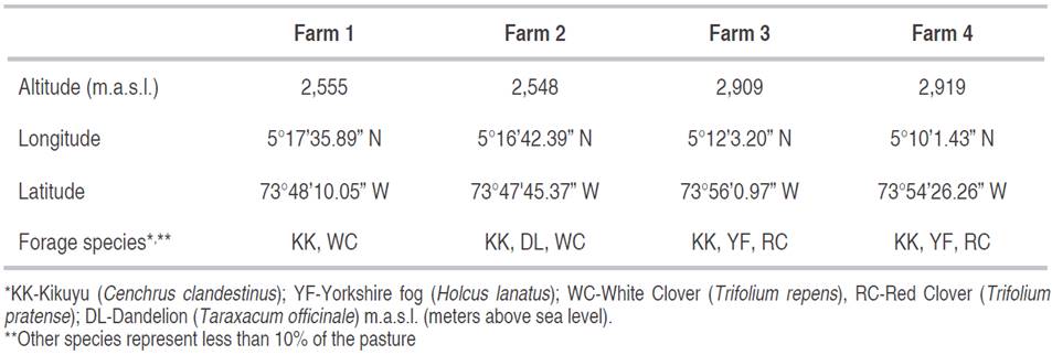 Four dairy farms located in the Ubaté province at two different altitudes (two at an average height of 2,552±5 m.a.s.l. and two at an average height of 2,914±7 m.a.s.l.) in the Colombian Andean zone were selected (Table 1). In each farm, an area of 75 m2 of Kikuyu pasture was divided into eight plots of 4 m2 each. Plots were separated from the main pasture by an alley of 50 cm, which was mowed continuously during the experiment. The separation among plots was 30 cm wide. Soil samples were taken in each farm close to the experimental area.