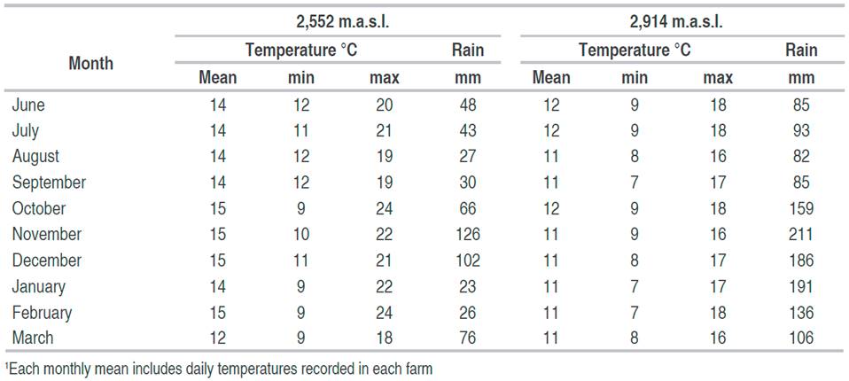 Environmental variables. During the experiment, the temperature was measured in each farm with a Datalogger (General® HT50, USA) that made measurements every half hour and stored the information in a USB memory. The amount of rain was measured with a pluviometer (Brixco 4358) in each of the farms, and the readings were recorded every three days (Table 2).