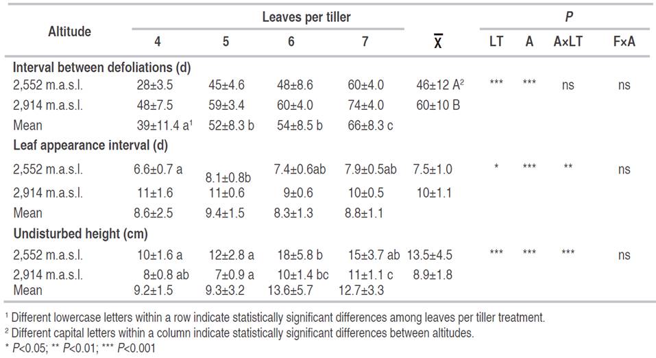 It has been reported that the altitude generates morphological changes in Kikuyu, and its lamina length is reduced at higher altitudes (Arango Gaviria et al., 2017). Herrero et al. (2000) found that Kikuyu decreases its growth as temperature drops, which occurs at higher altitudes. Lower temperatures reduce leaf elongation rate and increase the leaf appearance interval between them, which resulted in a higher interval (d) between defoliations at the same number of leaves per tiller (Table 3). However, the response to defoliation treatments (leaves per tiller) differs within altitude. At lower altitude, leaves required less time to appear when pasture was defoliated at four leaves per tiller but was similar among leaves per tiller at higher altitude (Table 3).