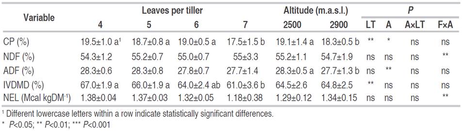No interactions were present among treatments number of leaves per tiller and altitude. Therefore, the results of the effect of the treatments or altitude on the nutritional quality of the pasture have been grouped (Table 4). There were no substantial differences in the nutritional composition of pastures associated with the number of leaves per tiller, except for the pastures harvested at seven leaves per tiller where CP and IVDMD were lower (Table 4). The nutritional quality was similar among the other treatments (three to six leaves). Similar behavior was observed for this pasture in Boyacá-Colombia at altitudes of 2,560 m.a.s.l. (Fonseca et al., 2016). It would suggest that Kikuyu pasture could be harvested at a different number of leaves per tiller (three to six) without compromising its nutritional quality at these altitudes.