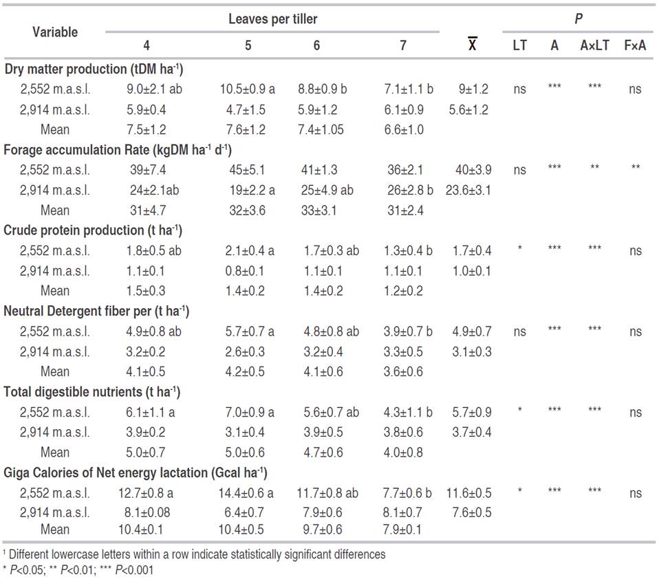 Dry matter and nutrients produced in 10 months were greater for pastures cultivated at 2,552 m.a.s.l. than the ones at 2,914 m.a.s.l., which resulted in higher accumulation rates (kgDM ha-1 d-1) for pastures grown at 2,552 m.a.s.l. However, the effects of the number of leaves per tiller on accumulation rates vary within altitude, which was similar for pastures with different leaves per tiller at 2,552 m.a.s.l. and lower for pastures with five leaves per tiller at 2,914 m.a.s.l. (Table 5). Additionally, the treatment of seven leaves per tiller had the lowest digestibility and protein level, which resulted in a lower yield of digestible nutrients at 2,552 m.a.s.l. for this treatment. Results suggest that Kikuyu pasture is resilient to a more frequent harvest, and that better yields of nutrients (CP, NEL) could be obtained when harvested at five leaves per tiller at 2,552 m.a.s.l. but that at 2,914 m.a.s.l. any of the defoliation treatments would yield similar amounts of nutrients (Table 5).