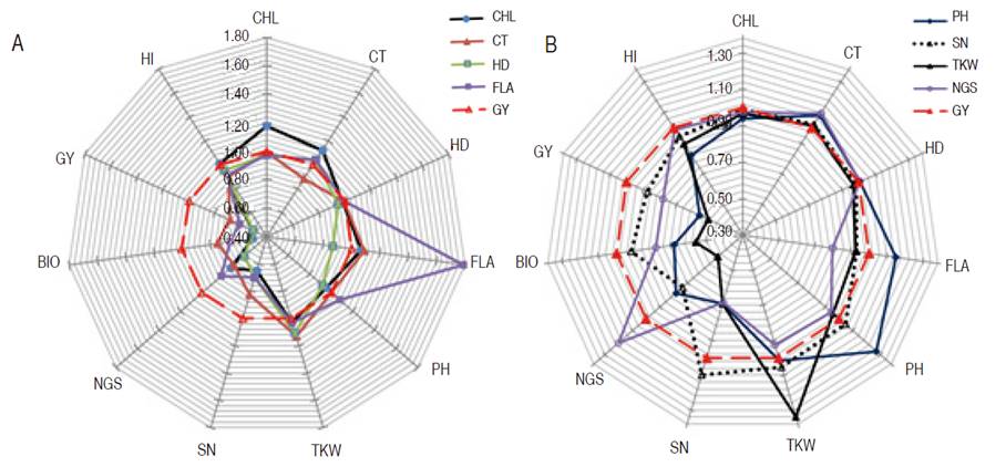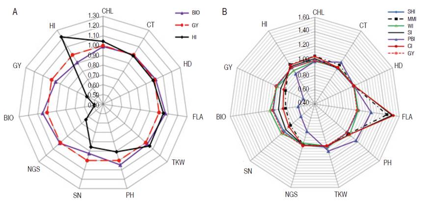 is the broad-sense heritability of the jth trait and is to the selection differential of the jth trait, in which the selected lines showed the best performance for the ith trait. Indirect selection gain is converted as the percentage of the population mean as follow: