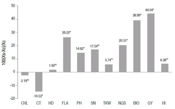 Figure 3: Relative deviation of the average of the 15 retained lines (XS) from the average (XC) of the three control varieties [100×(XS-XC)/XC)] for the assessed traits.