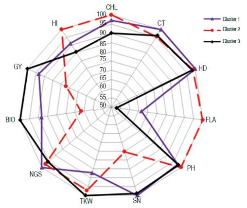 Figure 5: Behavior of the three clusters for the eleven measured traits in the top 15 selected lines.