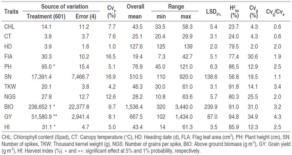 Even though the overall mean somewhat hid variability present among breeding lines, results of the analysis of variance revealed a significant genotype effect for plant height, above-ground biomass, grain yield, and harvest index at a 5% probability level. The residual coefficient of variation values (Cve) was below 17%, indicating a relatively good experimental precision (Table 1). Comparisons of range magnitude with critical value for yield components, and related agronomic traits, provide evidence of the presence of appreciable genetic variability among the breeding lines, suggesting that selection within these populations could lead to the identification of potentially useful breeding lines. Chlorophyll content varied from 33.5 to 58.3 Spad, canopy temperature ranged from 20.4 to 29.9 °C, heading date from 125.0 to 139 days, and fIag leaf area from 7.3 to 42.7 cm. Plant height ranged from 45.0 to 121.0 cm, the number of spikes from 110.0 to 920.0 spikes per m2, while thousand-kernel weight varied from 30.0 to 61.0 g and the number of grains per spike from 10.8 to 63.6 grains (Table 1). Above-ground biomass ranged from 320.0 to 3,440.0 g m-2, grain yield from 102.0 to 1,434.0 g m-2 and harvest index from 14 and 61.3%.