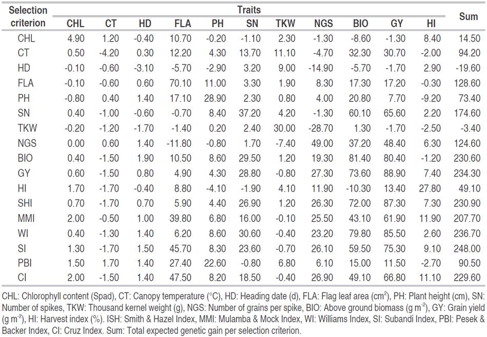 Expected genetic gains, expressed as a percent of the base population mean, are presented in Table 2. Total expected genetic gains varied from -19.6% for selection based on the number of days to heading to 248.0% for selection based on the Subandi index. Expected genetic gains exhibited by direct selection for CHL, CT, and HD were lower than 5.0% for CHL (4.9%), CT (-4.2%), and HD (-3.1%, Table 2). CHL selection improved FLA indirectly by 10.7%, HI by 8.4%, and reduced BIO by -8.6%. CT selection caused significant improvement in FLA, SN, TKW, BIO, and GY, which increased by 12.2, 13.7, 11.1, 32.3, and 30.7%, respectively. HD selection induced significant changes in TKW, which gained 9.0%, NGS, FLA, and BIO, which decreased by 14.9, 5.7, and 5.7%, respectively. CH, CT, and HD expected genetic gains derived from indirect selection for FLA, PH, SN, NGS, BIO, GY, and HI were almost nil, being less than 2.0% and were lower than expected genetic gains caused by direct selection (Table 2). CHL and CT have low broad-sense heritability, while HD showed relatively weak variability, as suggested by its low Cvg value (Table 1). These results corroborated with those of Bárbaro et al. (2007), who found that larger gains are generated from characters exhibiting greater genetic variation while lower gains are expected from selection for traits showing lower genetic variability. Based on the mono-trait selection and among the three traits cited above, CT, with total gains of 94.2%, comes out as a surrogate trait to improve indirectly and simultaneously FLA, SN, TKW, BIO and GY without any significant changes for the other measured traits. Mono trait selection for any one of the following variables FLA, PH, SN, NGS, TKW, BIO, GY, and HI, generated higher direct expected genetic gains than indirect selection. In fact, the expected genetic gains from direct selection against the best expected genetic gains of indirect selection were 70.1% vs 47.5% via CI, for FLA; 28.9% vs 22.6% via PBI for PH; 37.2% vs 30.6% via WI for SN; 30.0% vs 11.1% via CT for TKW; 49.0% vs 27.3% via GY for NGS; 81.4% vs 79.8% via WI for BIO; 88.9% vs 87.3% via WI for GY; and 27.8% vs 11.1% via CI for HI (Table 2). These results corroborated those reported by Bizari et al. (2017), who found that gains from direct selection were superior to those for indirect gains, for all the characters. Cargnin et al. (2007) compared three selection indices in 240 F2:4 wheat families derived from eight segregating wheat populations and reported that the highest gains were estimated by direct selection. The advantage of multi-trait selection is analyzed based on total expected genetic gains. As total gains obtained from SHI, MMI, WI, SI, and CI selection indices were of the same magnitude as those generated through selection based on GY (Table 2).