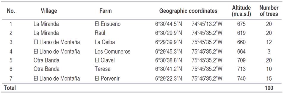 One hundred trees of M. cordata in the reproductive stage, distributed in seven farms from 619 to 740 m.a.s.l., were selected and georeferenced (Table 1).
