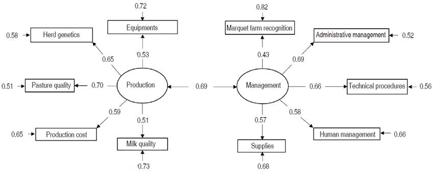 Although variable Farm recognition in the market had the lowest factor load (0.43), it is important to highlight how the decision to adopt technology is positively influenced by the image that the farm could project in the sector. This result is somewhat unusual, considering that this market has a regional oligopsonic structure where, in normal conditions, the total production of milk is sold (Von Keyserlingk et al., 2013). This could be associated with having a productive system with technology levels in line with or higher than the industry standard, which in the long term can be considered as a sustainability strategy for the organization (Adefulu, 2015).