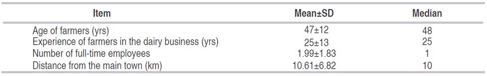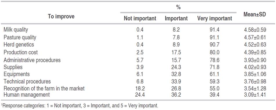 The average age of farmers was 47±12 years, and they had 25±13 years of experience in dairy farming (Table 1). Both traits are known to favor productivity, considering that experiential knowledge facilitates decision-making (Cuartas-Martínez et al., 2018). However, this knowledge was not accompanied by academic training; on average, they attended through eighth grade, which means they did not complete high school. This finding is known to discourage "Management by Competencies" and limits individual and organizational learning (Pardo and Díaz, 2014). This could explain why the Colombian dairy sector has been focused for years on its survival rather than growth and business development (Barrios et al., 2016).