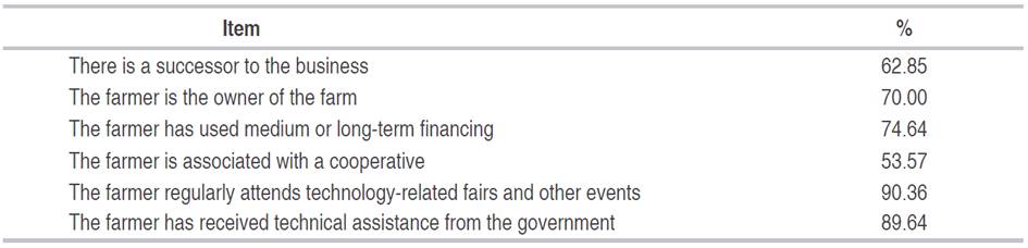 Regarding organizational characteristics, 70% of producers work in their own farms (Table 2). This factor, added to the fact that in 62.85% of cases there was a successor to the business, could promote the adoption of new technologies by this type of organization since there is certainty about the fate of the property in the long term. It could be related to the fact that 74.64% of farmers have used medium or long-term financing, a figure higher than that found by Rodríguez et al. (2015), who reported, for the same region, a 38% credit-access rate. In that study, they also reported that the technical assistance rate was 50%, meaning that coverage of technical assistance and technology transfer programs have improved in recent years, reaching 89.64% for the surveyed organizations. These results are positive because such programs help to guide farmers towards appropriate decision-making processes (Cerón-Muñoz et al., 2015).