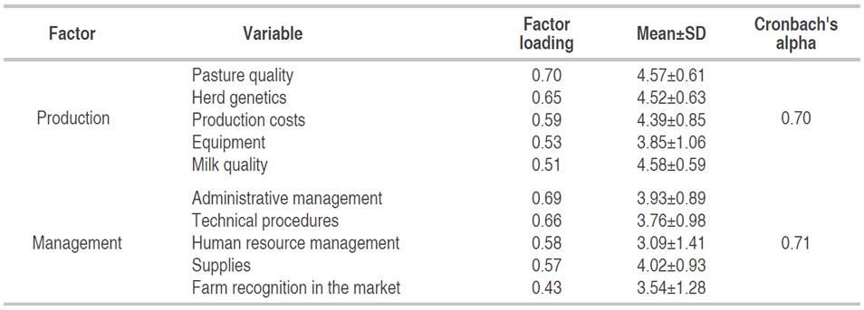 The second factor, "Management," was impacted by variables: Administrative management, Technical procedures, Human resource management, Supplies, and Farm recognition in the market. The variables with the greatest weight in the factor were Administrative management (0.69 factorial load) and Technical procedures (0.66 factorial load). These variables are related to document management, which denotes the importance of information traceability for adequate analysis and subsequent decision making (Londoño et al., 2016).