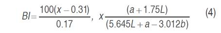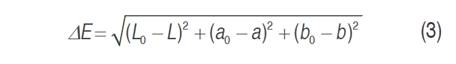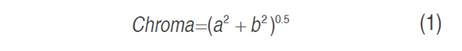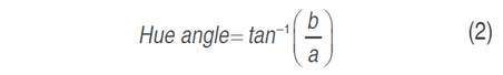 The color was quantified by a HunterLab ColorFlex color measurement instrument (HunterLab, Reston, VA). The Chroma value (Equation 1), Hue angle (Equation 2), the total color difference (ΔE) (Equation 3) and browning index (BI) (Equation 4), were calculated from the Hunter L* (whiteness or brightness/darkness), a* (redness/greenness), and b* (yellowness/blueness) -values. The ΔE is a single value which considers the differences between the L*, a*, and b* of the sample and standard (subscript “o” refers to the color reading of soursop leather at zero time) (HunterLab, 2008); and BI, describes the color change during storage or processing (Maskan, 2001).
