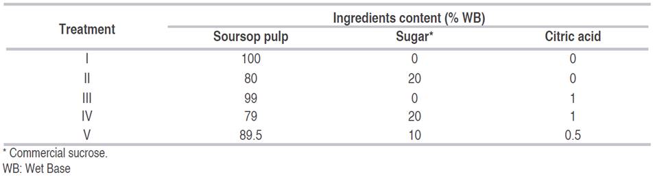 The chosen soursop leathers, to evaluate their characteristics over time (pulp:sugar:citric acid)% WB, were: TII (80:20:0) the optimum mixture, and TV (89.5:10:0.5) the mid-point; also considered a good selection, from the nutritional point of view, because it has a lower sugar content, the lowest concentration of citric acid, and also has occupied the third place in the acceptability ranking (IV> II> V> I > III). Treatment TIV was ruled out of this part of the study because the addition of citric acid had no significant effects.