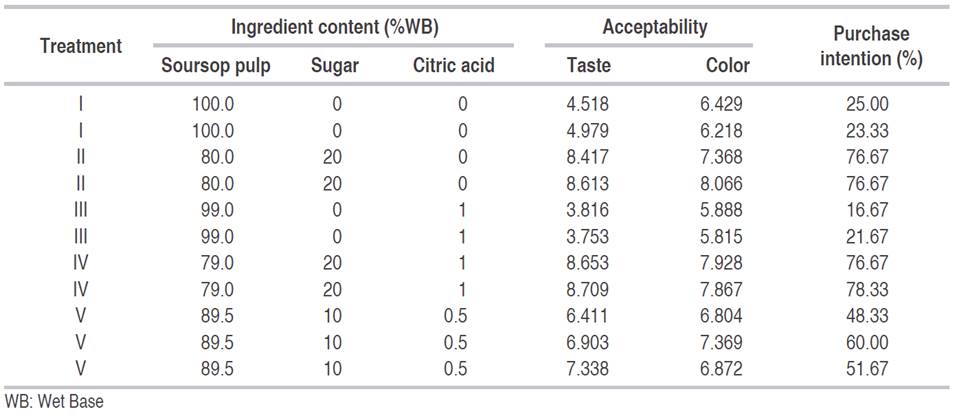 Table 2 shows the average response values of the experimental design of mixtures, used to determine the effect of the concentration of soursop pulp, sugar, and citric acid on the acceptability (taste, color), and intention of purchase of the soursop leathers. The acceptability of the evaluated attributes, taste and color, were found in a range from 3.753 to 8.709 and 5.815 to 8.066, respectively. These values are higher than those reported for apple:banana pulp fruit bar supplemented with omega-3 fatty acid (Parimita and Puneet, 2015), peach pulp:soybean slurry leathers (Anju et al., 2014) or soursop pulp:katuk leaves puree leathers covered with chocolate (Utomo et al., 2014). It could be considered that preparing a leather with fewer ingredients, promotes the acceptability of the product because it has a more fruity taste. The intention of purchase was between 16.67 and 78.33%.
