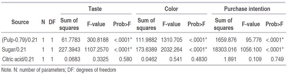 Table 3: Test of the effects of the variables soursop pulp, sugar, and citric acid.