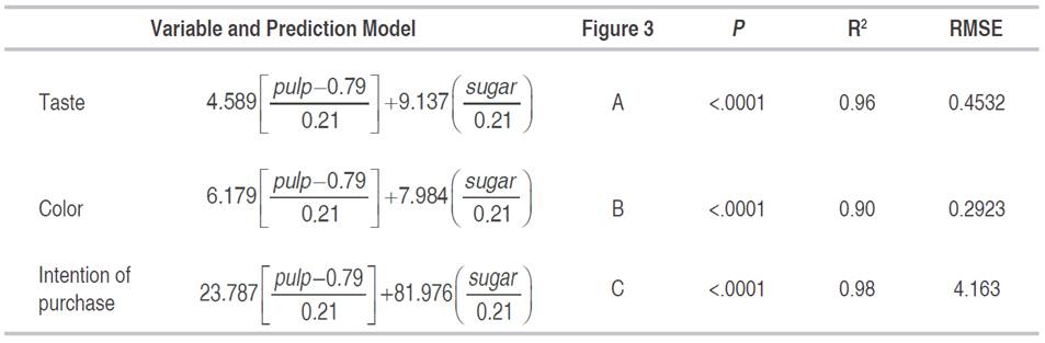 All the linear models for each response variable studied (Figure 2), were significant (P≤0.001), with coefficients of determination (R2) greater than 90%, showing a good fit. On the other hand, the estimated coefficients for these models were also significant (P≤0.001), except those associated with the concentration of citric acid, which was expected because this factor was not significant for acceptability (taste, color), or intention of purchase. Consequently, the terms associated with it were excluded from the adjusted models (Table 4).