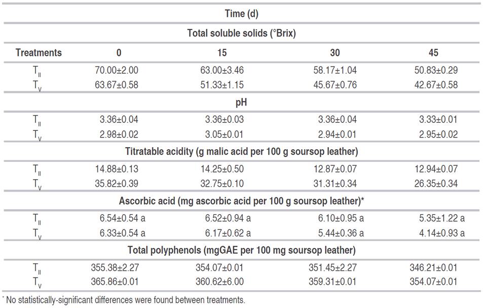 Total polyphenols. It is reported that Annona fruits, as raw material, are a source of phenolic compounds. For example, Annona muricata L. has 624.2-941.4 mgGAE mg-1 pulp (Vit et al., 2014) and Annona squamosa 583.45 µg catequina mL-1 (Melo et al., 2008) what makes this fruit an attractive alternative to prepare this kind of products. At day 0, the total polyphenols were 355 (TII) and 366 (TV) mgGAE mg-1 soursop leather. It is observed that the lower content in the leathers, compared to the raw pulp (Vit et al., 2014), it is because of the fruit processing and heat treatment during the leather preparation (Hernández et al., 2012). However, it is considered that this total polyphenol content, together with the natural ascorbic acid of the soursop pulp, gives this product healthy characteristics. In soursop leathers, the total polyphenol content decreased over time in both treatments. TII showed significantly (P≤0.05) lower total polyphenol content than TV from day 0 to day 45. It is presumed that a higher pulp content gives a higher concentration of total polyphenols in the leather; observable fact when comparing both treatments. On the other hand, the decrease in total polyphenols in the leather is attributable to the type of packaging (transparent cellophane bags) and the storage conditions of this study.