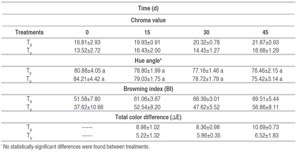 pH and titratable acidity. At the beginning of the evaluations, the pH was 3.36 and 2.98 for TII and TV, respectively, favoring pectic gelification during leather formation (Damodaran et al., 2010). Meanwhile, the titratable acidity was 15 and 36 g per 100 g fruit leather, respectively; this may occur because of the latest treatment has citric acid. The pH was significantly (P≤0.05) lower in TV from day 0 to day 45; accordingly, at minor pH higher acidity, that is why the titratable acidity was significantly higher (P≤0.05) in TV from day 0 to day 45. In soursop-katuk leaves puree, leathers the titratable acidity was between 31-44 g per 100 g fruit leather, corresponding to the katuk leaves puree content (Utomo et al., 2014).