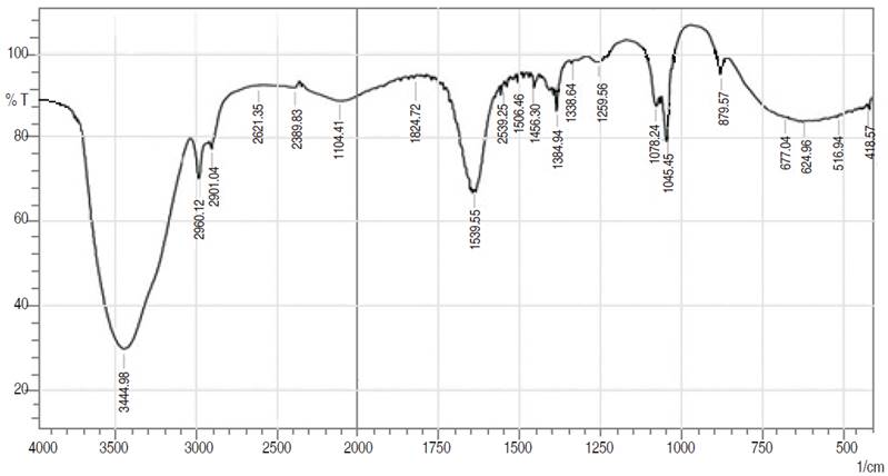 Figure 1: FTIR spectrum of bioethanol produced from BSG