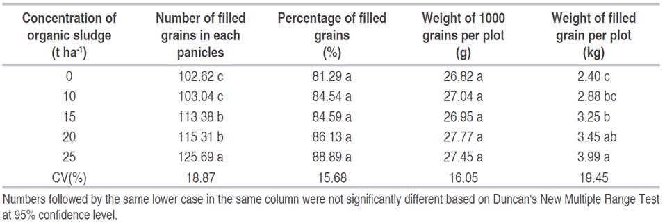 According to Table 2, application of organic sludge in different concentrations impacted the parameter of quantity of filled grains in each tiller and grain yield from each plot but it did not affect the percentage of filled grains and the weight of 1000 grains (P<0.05).