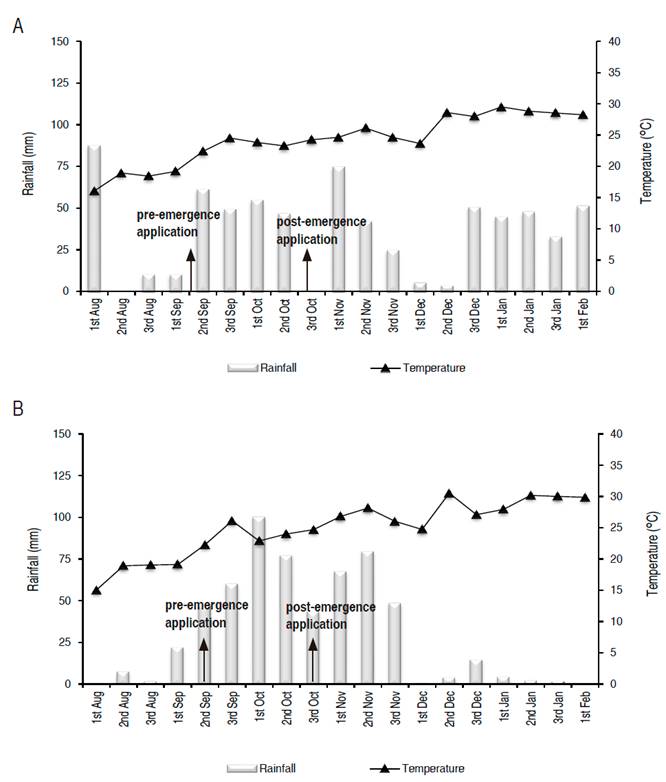 Two experiments were installed in a commercial area in 2018-2019 season. Palotina, Paraná (PR), Brazil, (24°2326.93"S 53°84'51.36"W) and Corpus Christi, Canindeyú, Paraguay (24°3'37.24"S 55°0'22.22"W) were the locations selected. The climate of both regions is classified as Cfa (humid subtropical with abundant rainfall, well distributed throughout the year), according to Köppen classification. Figure 1 (A,B) presents climate data during the period of experiment conduction.