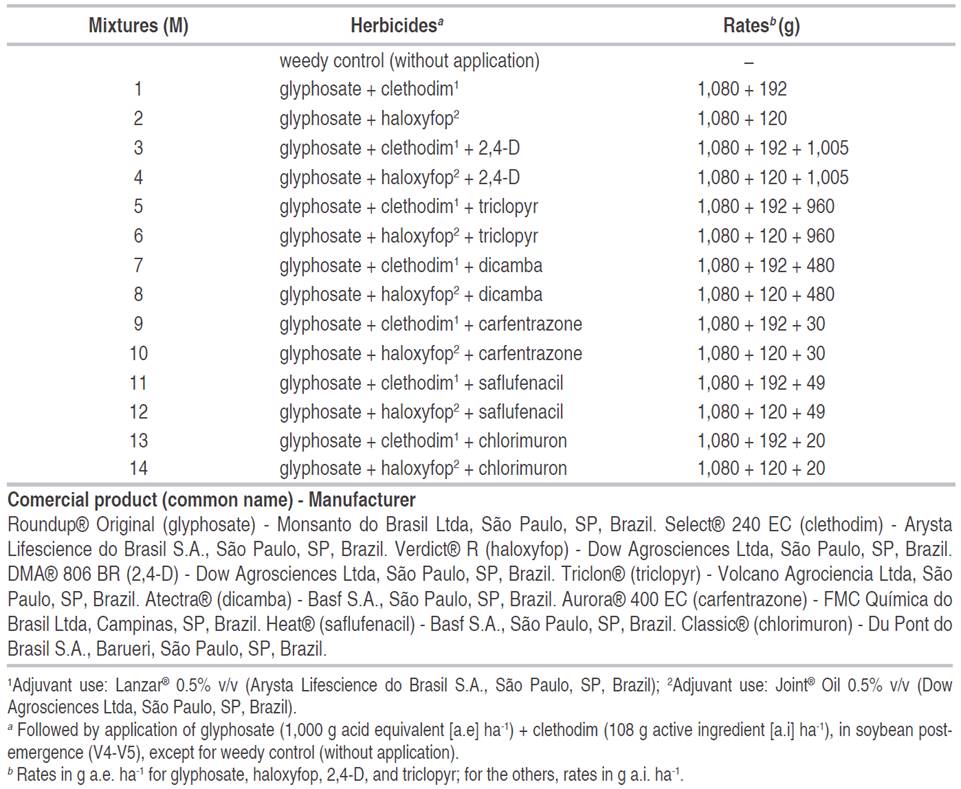 Both areas had a high population of perennial sourgrass at flowering stage, with records of use of glyphosate, and its loss of efficacy in recent years. Palotina assay had a populational density average of 1 to 2 tufts m-2, meanwhile, in the Paraguay area, the populational density was higher, 2 to 4 tufts m-2. The experiments were installed in a fallow field, prior to soybean sowing. Previously, the Palotina area had been cultivated with maize crop, and Corpus Christi was a fallow area since the soybean harvest in summer (without second season crop). A randomized block with four replications was used in the experimental design. The experimental plots were composed of 3x5 m-2. The treatments are described in Table 1.