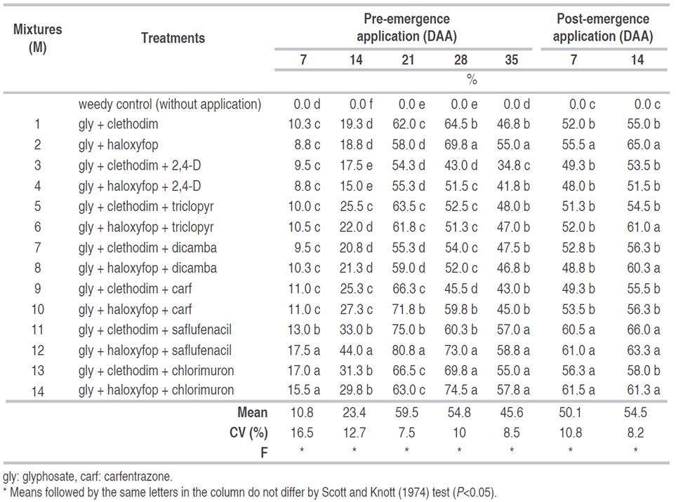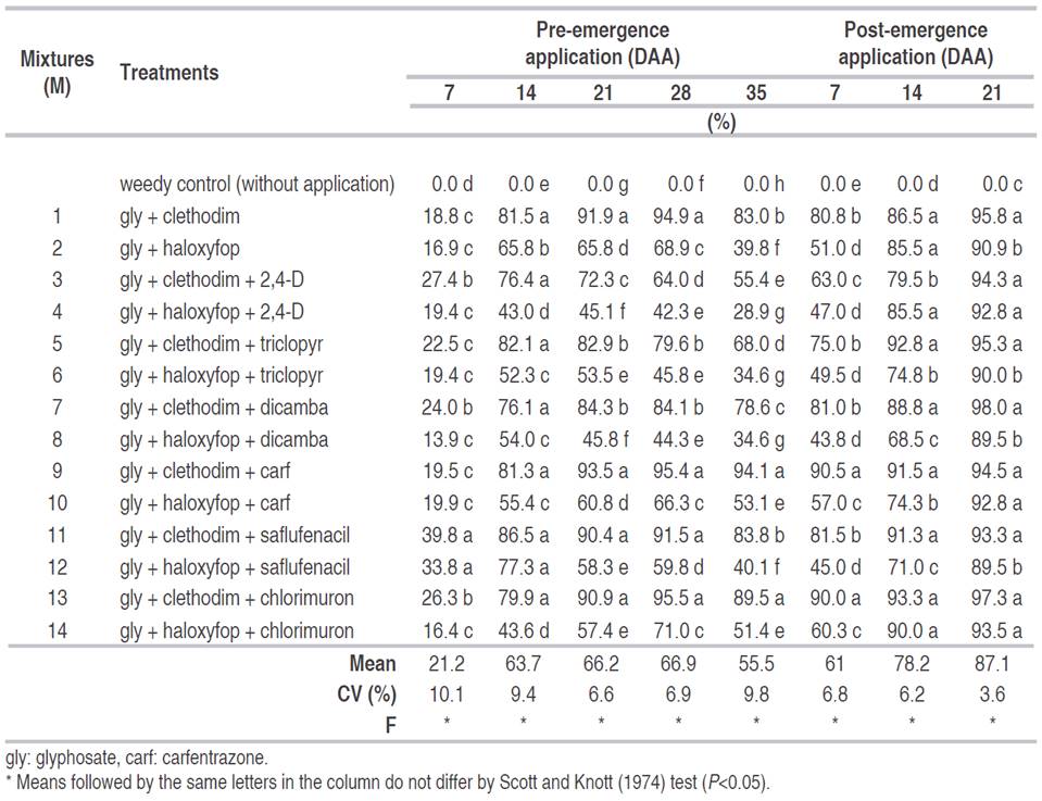 Table 2: Control treatments to D. insularis at 7, 14, 21, 28, and 35 days after the application (DAA) of herbicides, at soybean pre-emergence, and at 7, 14, and 21 DAA at soybean post-emergence. 2018-2019 season, Palotina, PR, Brazil.