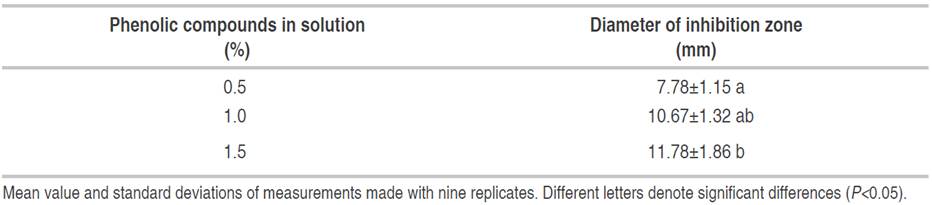 The solutions of phenolic compounds at concentrations of 1 and 1.5% showed the highest in vitro inhibition of Salmonella spp., requiring 2 h to achieve a complete inhibition of the bacteria.