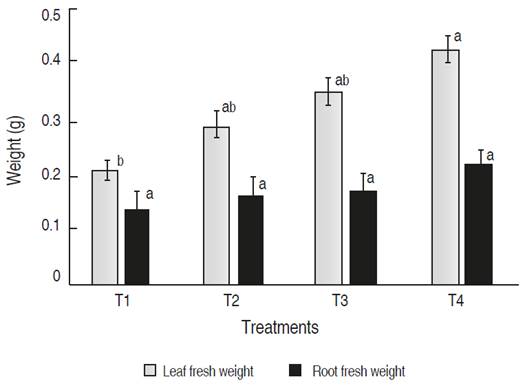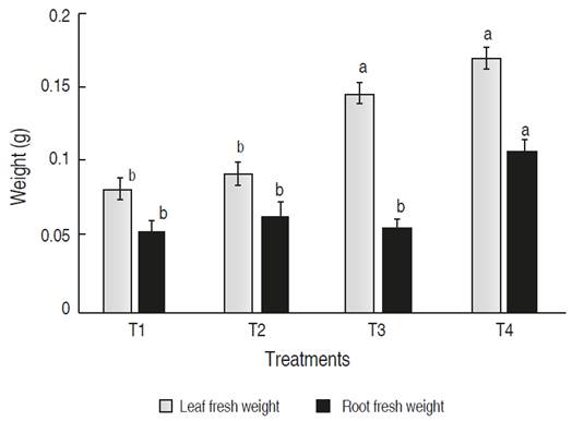 Figure 1: Effect of EM and FitoMas-E® on the foliar and root fresh weight of seedlings of Capsicum annuum L. T1: Control (without application of bio-products), T2: EM (4 mL m-2), T3: FitoMas-E® (0.1 mL m-2), T4: EM (4 mL m-2) + FitoMas-E® (0.1 mL m-2). Different letters indicate statistical differences among treatments for each organ (Duncan test, P<0.05).
