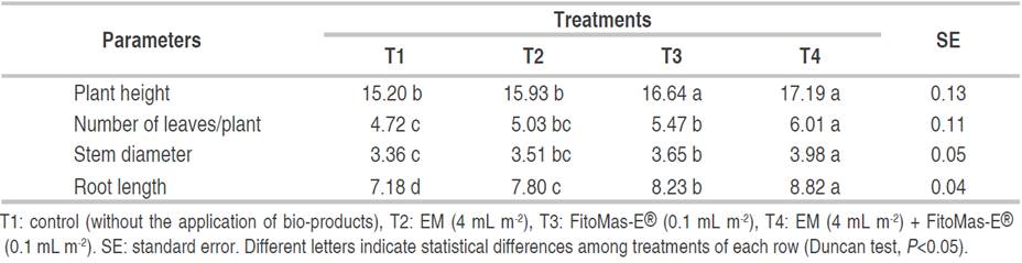 Table 1 shows the effect of both bio-products and their combination on distinct growth parameters. Plant height is an important indicator of seedling quality to achieve a successful transplant. The tallest seedlings were recorded for those treated with FitoMas-E® (T3) and the combination of EM and FitoMas-E® (T4), with no statistical difference between them; whereas T2 showed no positive response compared to the control. Similarly, T3 and T4 reported the highest number of leaves per plant and highest stem diameter among all treatments. Root length increased with the application of EM and FitoMas-E alone or with the combination of these bio-products. The highest value was observed with the combined application (T4), followed by T3 and T2.