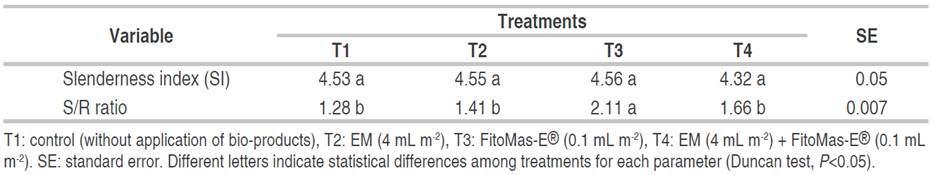 Table 2 shows the slenderness index (SI) and the shoot/root ratio (S/R) for pepper seedlings after the application of FitoMas-E® and EM. SI showed similar results for all treatments and control. The application of FitoMas-E® at 0.1 mL m-2 (T3) increased the shoot/root ratio, whereas this relation was similar among the rest of the treatments and control. In the present work, SI ranged from 4.32 up to 4.56 without differences among treatments with the application of the bio-products and control. The fact that FitoMas-E® and/or EM did not affect SI, may indicate a proportional increased of plant height and stem diameter, and the suitability of SI to be used to select pepper seedlings with quality.