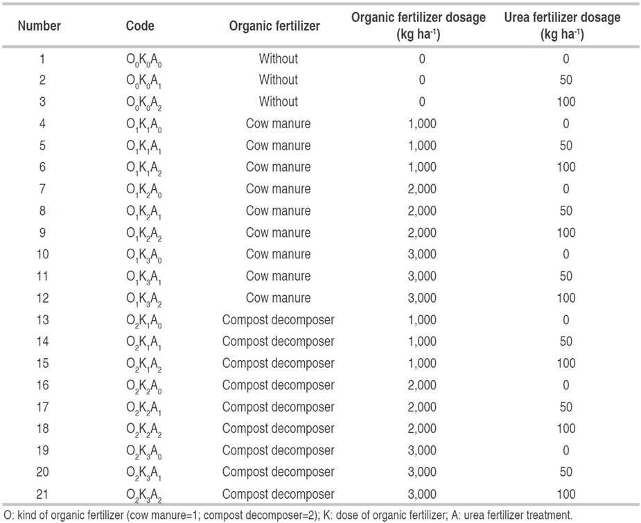 Organic fertilizer was made from cow manure with liquid decomposer, urea, SP-36, and KCl. Using a complete randomized design, combination of 21 treatments were repeated 3 times with 4x3 m plot size. Analysis of variance was carried out to compare the means of measurement data and then a Duncan Real Difference Test (DMRT 5%) was performed (Gomez and Gomez, 1984). Organic and chemical fertilizer combination of the 21 treatments is described in Table 2.