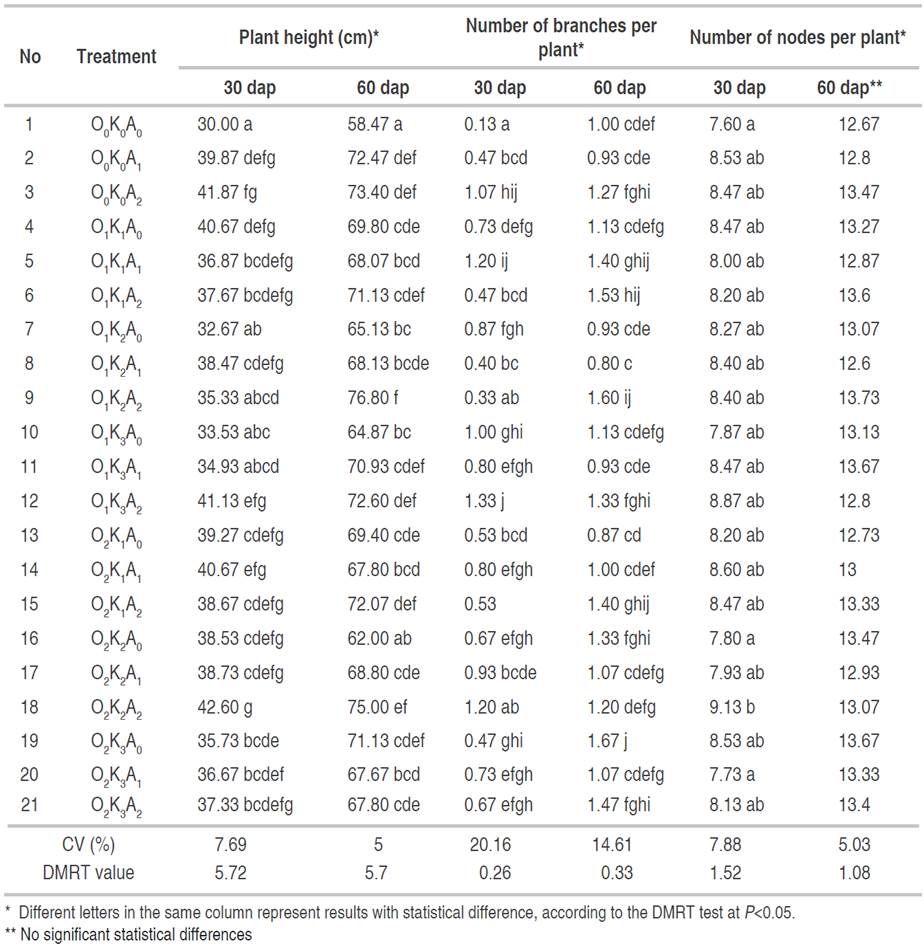 Treatment (O2K2A2) using 2,000 kg ha-1 compost with urea 100 kg ha-1 and treatment (O1K2A2) using 2,000 kg ha-1 cow manure with 100 kg ha-1 urea at 30 and 60 dap showed the highest plant height for each period, respectively. Meanwhile, the largest number of branches was found in treatment (O1K3A2) using 3,000 kg ha-1 cow manure with 100 kg urea ha-1. At the age of 60 dap, the largest number of branches was obtained using 3,000 kg ha-1 compost without urea (O2K3A0) treatment, but it did not show real difference with treatment of 1,000-2,000 kg ha-1 (O1K1A1 and O1K1A2) manure or compost 1,000 kg ha-1 with 100 kg of urea ha-1 (O2K1A2). The differences in number of nodules were noticed significantly at 30 dap and treatment using 2,000 kg ha-1 compost + 100 kg of urea ha-1 showed the highest number of nodules (O2K2A2). Results of this study demonstrated that the addition of organic and chemical fertilizer showed higher yield in soybean compared to treatment using only chemical fertilizer (Qaswar, 2020). Some research studies showed that the application of cow manure compost would increase both soil fertility and crop yield (Hernandez, 2014; Liu et al., 2018). Application of organic and inorganic fertilizer has showed effect for sustainability in soil and may positively affect soybean production (Choudhary et al., 2021).