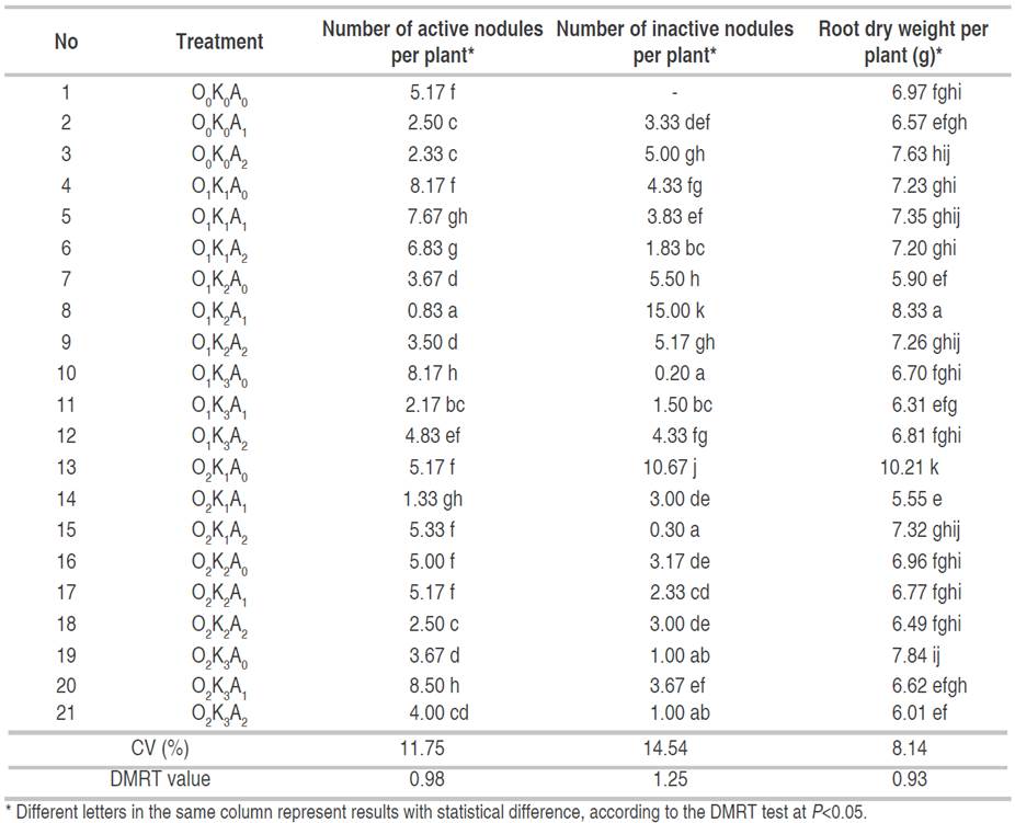 The highest dry weight of roots per plant (10.21 g) was found in treatment (O2K1A0), which used 1,000 kg ha-1 compost without urea fertilizer. In accordance with this result, it was confirmed that organic management has a significant impact in rhizobia genotype presentation in that area. Rhizobia numbers was increased in term of diversity in this kind of field, since organic fertilizer is a good medium for the development of the rhizobia genotype so that it has an effect on N-fixation from air (Grossman et al., 2011).