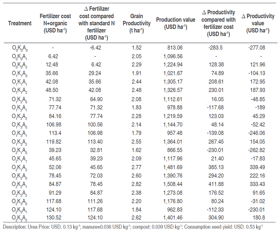 A combination of 2,000 kg ha-1 compost and urea 50 kg ha-1 (O2K2A1) resulted an additional yield about 770 kg ha-1 compared to application of 50 kg urea only. Thus, farmers could obtain additional gross profit up to 411.88- or 333.43 USD ha-1 for net profit. This profit number could be obtained by O2K1A2 treatment.
